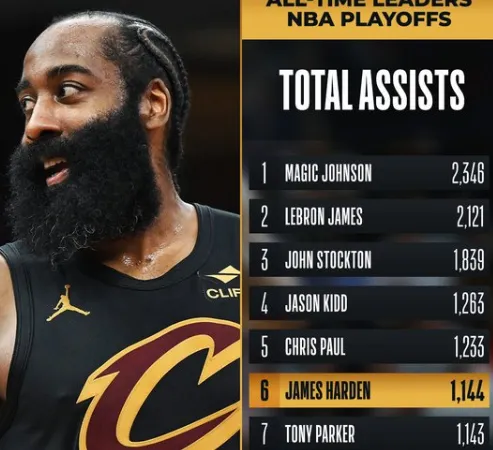至此,哈登生涯季后赛助攻数达到1144次,升至季后赛历史助攻榜第6位。