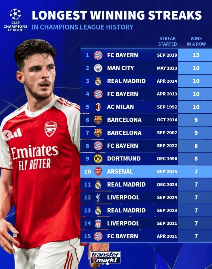 虎扑01月21日讯 德国转会市场盘点了欧冠历史上最长的连胜纪录,详情如下: