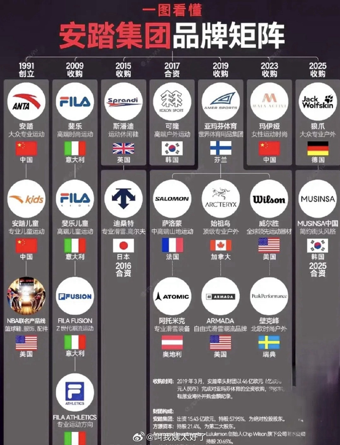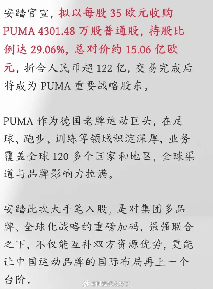 安踏收购彪马跻身全球体育品牌前三|安踏帝国|彪马(Puma)|安踏(ANTA)|始祖鸟(Arc'teryx)|运动时尚_新浪体育_新浪新闻 xiaoqiao 2026年01月28日 10:23 72 0 彪马被安踏收购!!安踏帝国堂堂来袭,已经位列世界体育品牌第三了。[傻眼] 发布于:河北